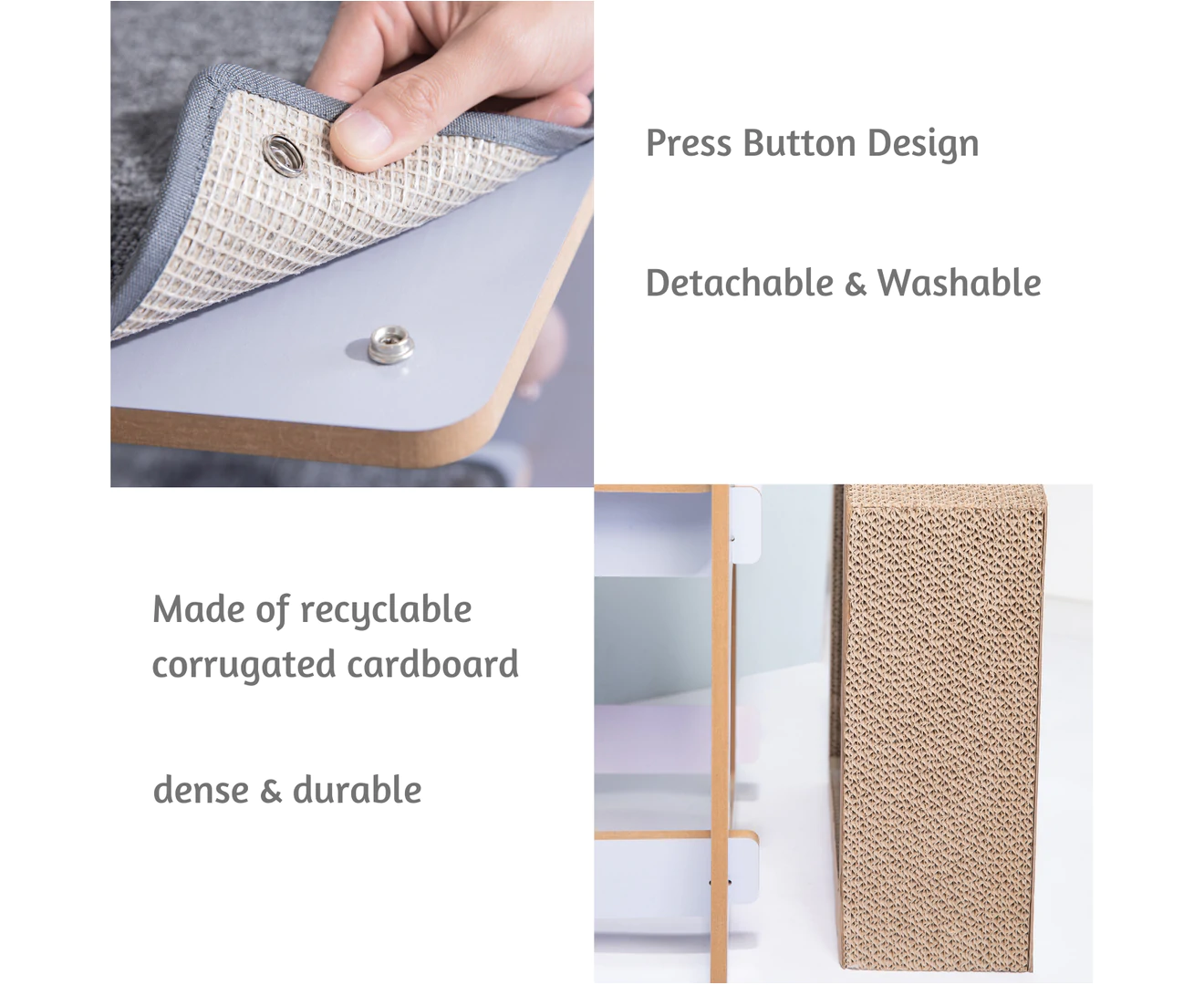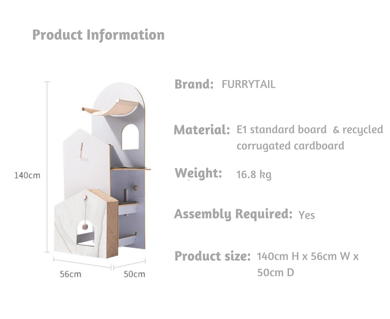 Treat your cat with the sophisticated Furrytail Cat Time Scratching Tower. Your kitty will love exploring all of the different levels and playing in the hidey holes, providing important exercise and stimulation. Once they are exhausted themselves they can relax and take a cat nap in the hammock or sharpen their claws on the cat scratcher. With a modern chic design this cat tree will make a great addition to any household. Made from strong durable recycled cardboard with a non-slip removable loop-pile pad for easy cleaning and a hanging toy for additional playtime.