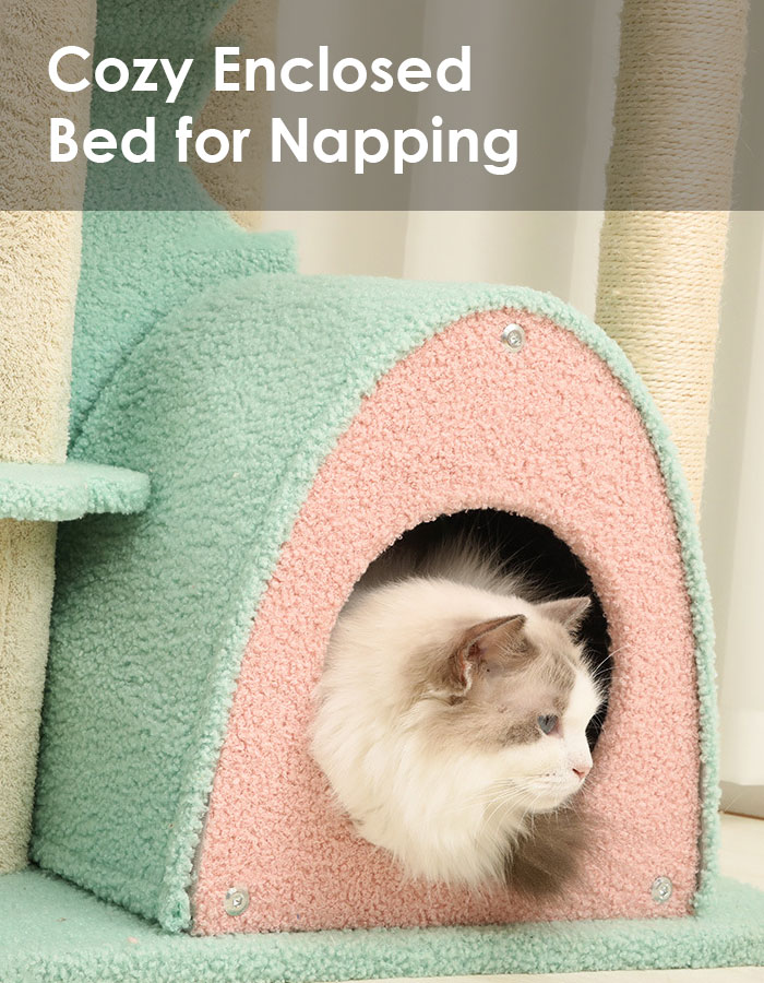 Cozy Enclosed Bed for Napping – The bottom tier of the cat tree features a cozy enclosed space where your cat can retreat for some peace and quiet or a nap.