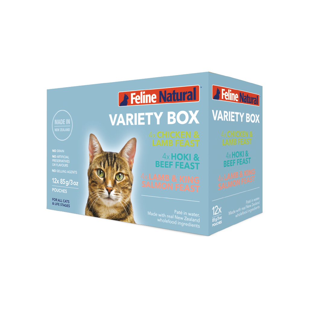 Made in New Zealand with cage free Chicken, grass-fed free range Lamb and Beef, and sustainably caught King Salmon and Hoki. In a convenient variety box with 3 flavours, each pouch is in a mess-free and easy to use single serve.