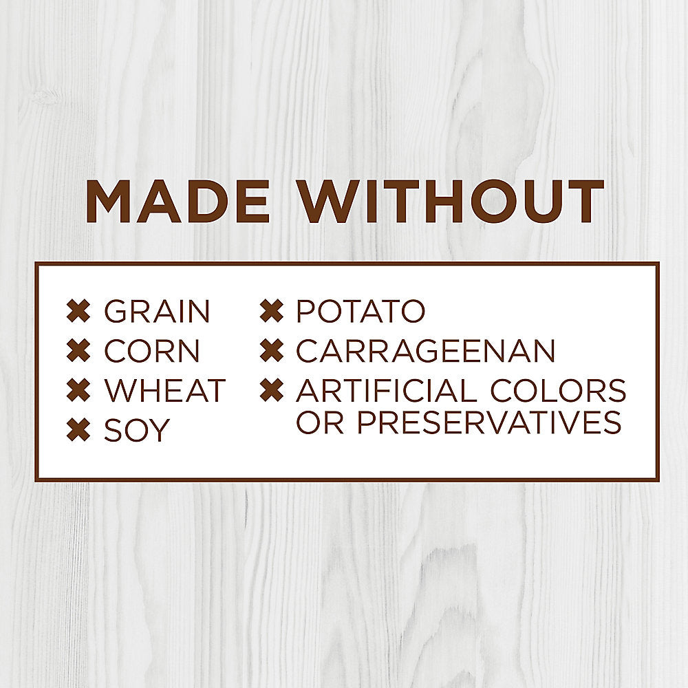 • Made without - grain, potato, corn, wheat, soy, by-product meal, artificial colors or preservatives