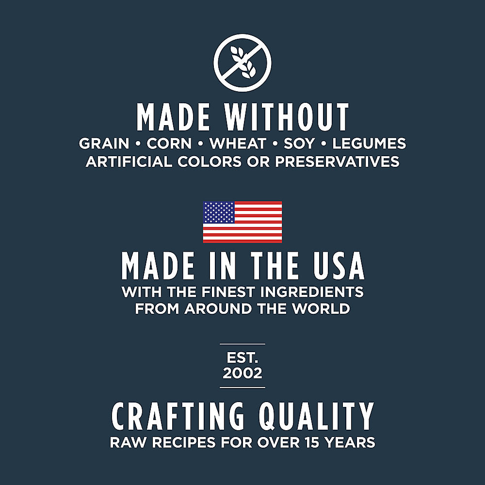 Responsibly sourced meat, non-GMO fruits and vegetables plus other wholesome ingredients in a complete & balanced raw meal