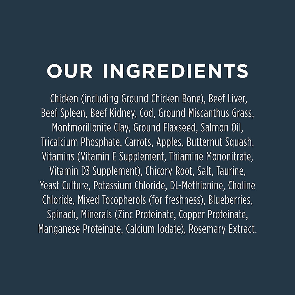 Chicken (including Ground Chicken Bone), Beef Liver, Beef Spleen, Beef Kidney, Cod, Ground Miscanthus Grass, Montmorillonite Clay, Ground Flaxseed, Salmon Oil, Tricalcium Phosphate, Carrots, Apples, Butternut Squash, Vitamins (Vitamin E Supplement, Thiamine Mononitrate, Vitamin D3 Supplement), Chicory Root, Salt, Taurine, Yeast Culture, Potassium Chloride, DL-Methionine, Choline Chloride, Mixed Tocopherols (for freshness), Blueberries, Spinach, Minerals (Zinc Proteinate, Copper Proteinate, Manganese Proteinate, Calcium Iodate), Rosemary Extract.