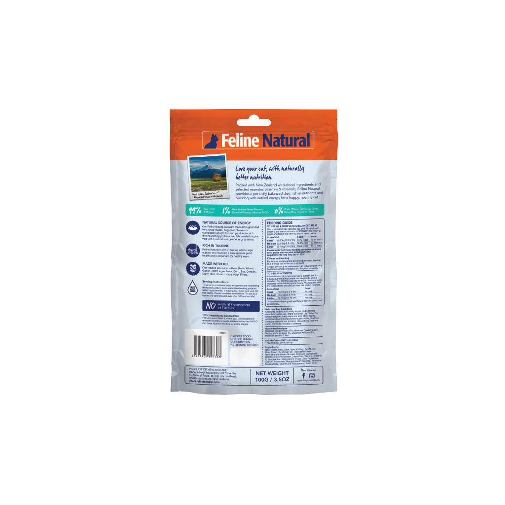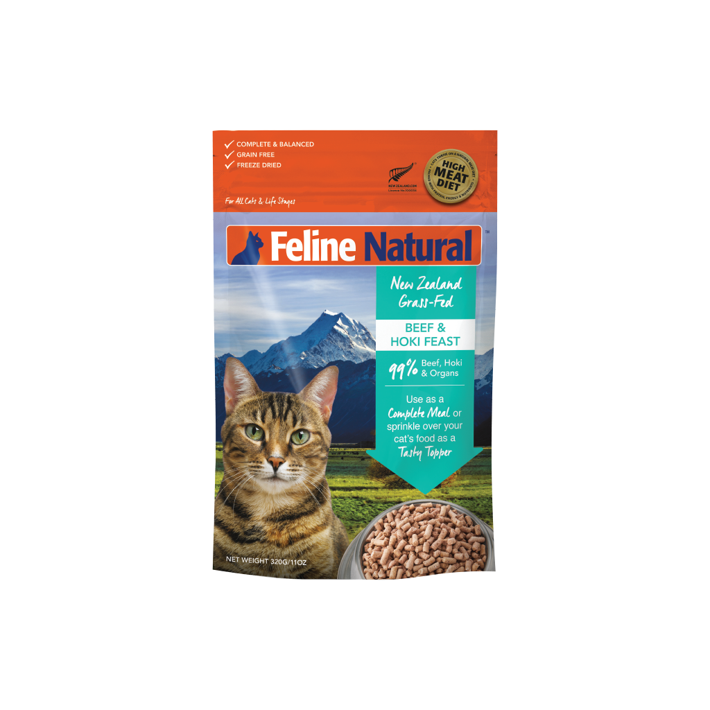 Made in New Zealand with grass-fed, free-range Beef and sustainably caught Hoki, this Freeze-dried Beef & Hoki Feast assists brain and eye development and is a great diet for Kittens.