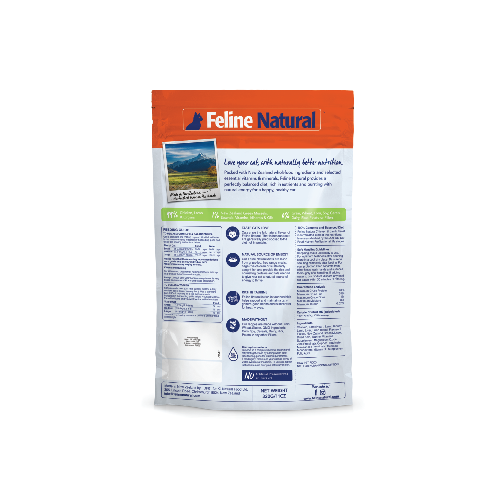 Chicken, Lamb Heart, Lamb Kidney, Lamb Liver, Lamb Blood, Flaxseed Flakes, New Zealand Green Mussel, Dried Kelp, Taurine, Vitamin E Supplement, Magnesium Oxide, Zinc Proteinate, Copper Proteinate, Manganese Proteinate, Thiamine Mononitrate, Vitamin D3 Supplement, Folic Acid.