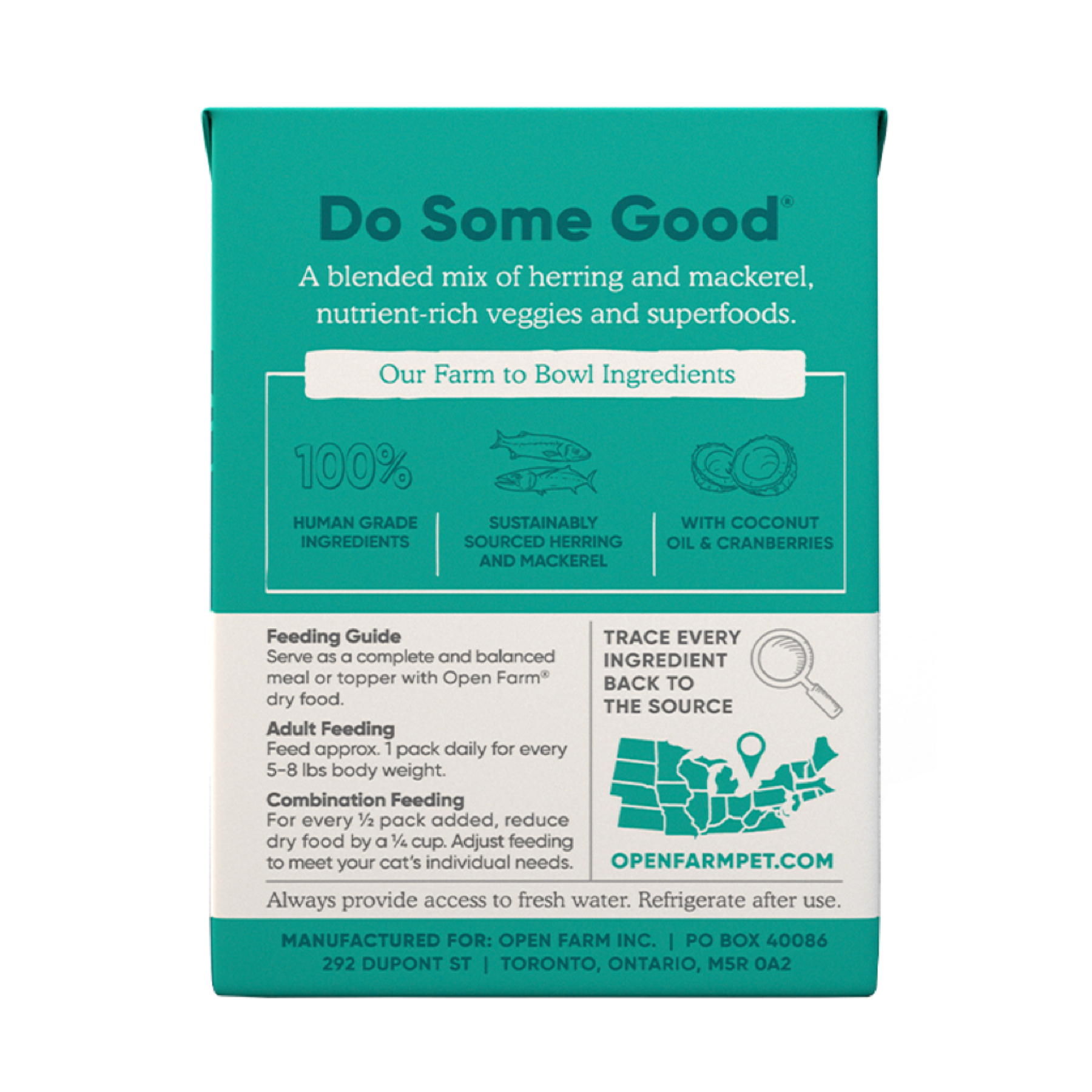 This combination of proteins is a great source of DHA and Omega 3 fatty acids thanks to a mix of Ocean Wise® approved wild-caught herring and mackerel, with added veggies and superfoods — best served as a complete meal or kibble topper.