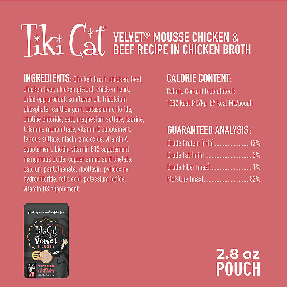 As obligate carnivores, cats have a natural instinct to hunt after dark and a nutritional need to eat meat. Tiki Cat® After Dark® Velvet™ Mousse is a meat-lover’s dream, closely mimicking cats’ natural prey diets in a silky smooth mousse form.