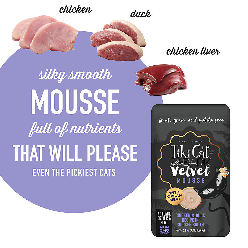 As obligate carnivores, cats have a natural instinct to hunt after dark and a nutritional need to eat meat. Tiki Cat® After Dark® Velvet™ Mousse is a meat-lover’s dream, closely mimicking cats’ natural prey diets in a silky smooth mousse form.