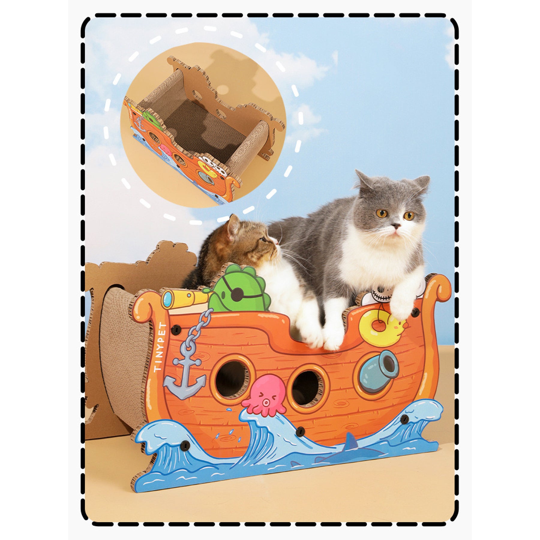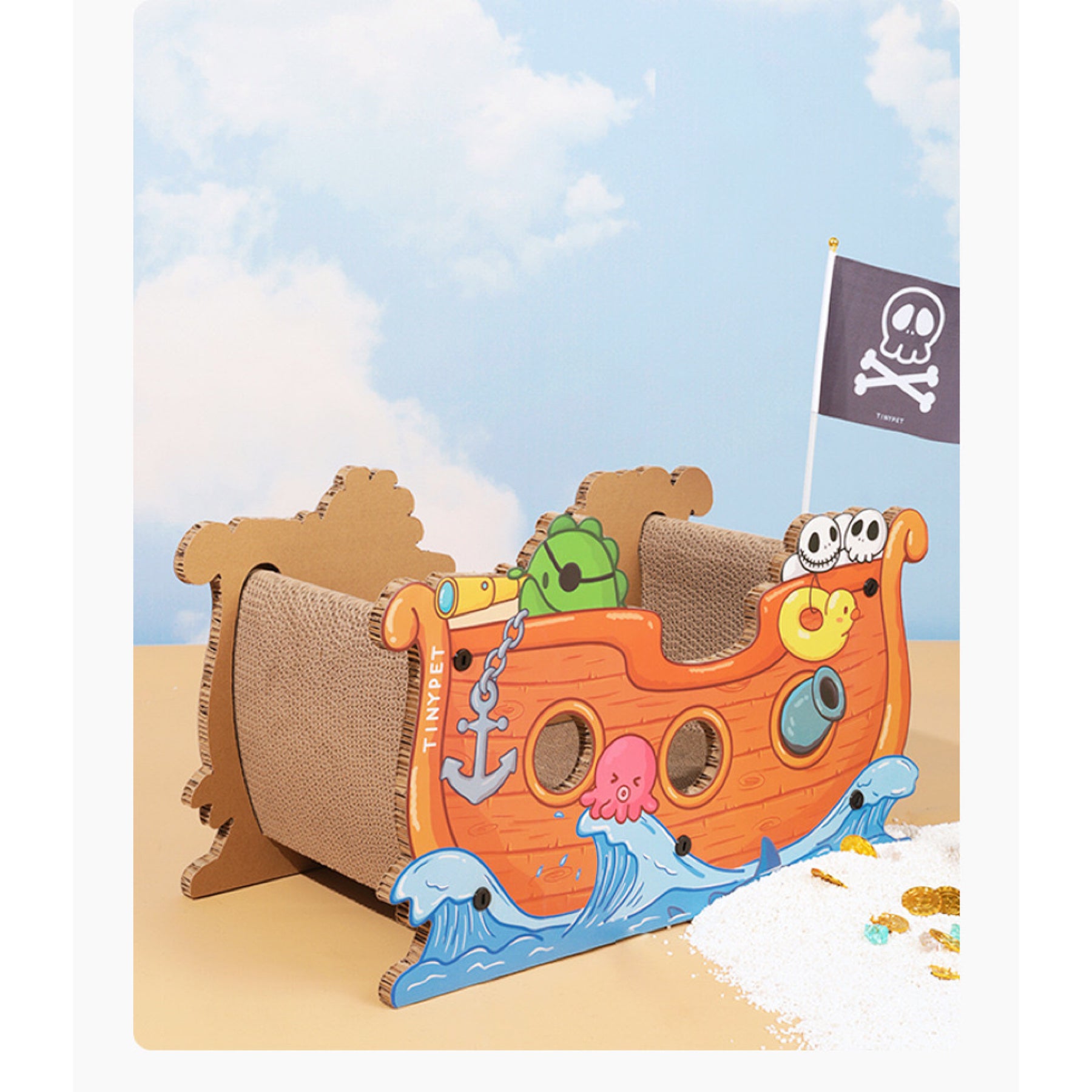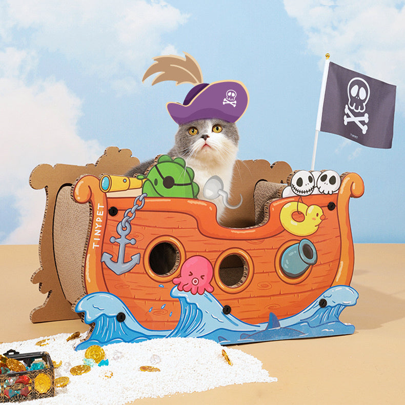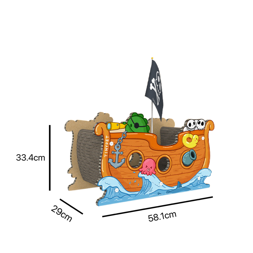 Captain cat is and its corsair is here! High-density corrugated boards allow the cats to rest, sharpen their paws, and play. The pirate boat is supported by thick corrugated cardboard on both sides, making it less likely to collapse and more durable. Multiple interactive windows, each with a diameter of 6 cm. Plastic screws are fixed so that it is not easily deformed and collapsed. Are you ready? Captain Cat is ready to set sail!