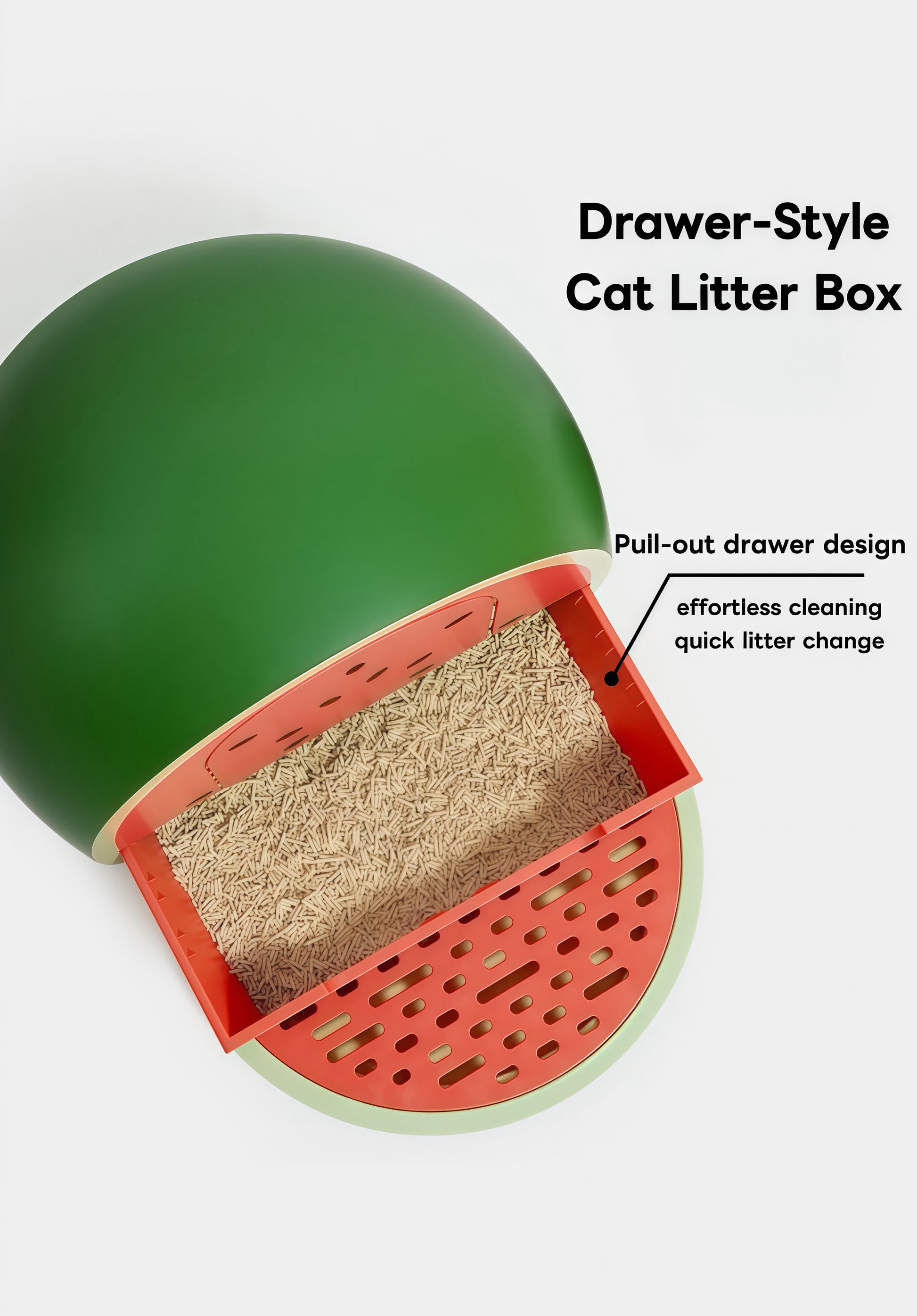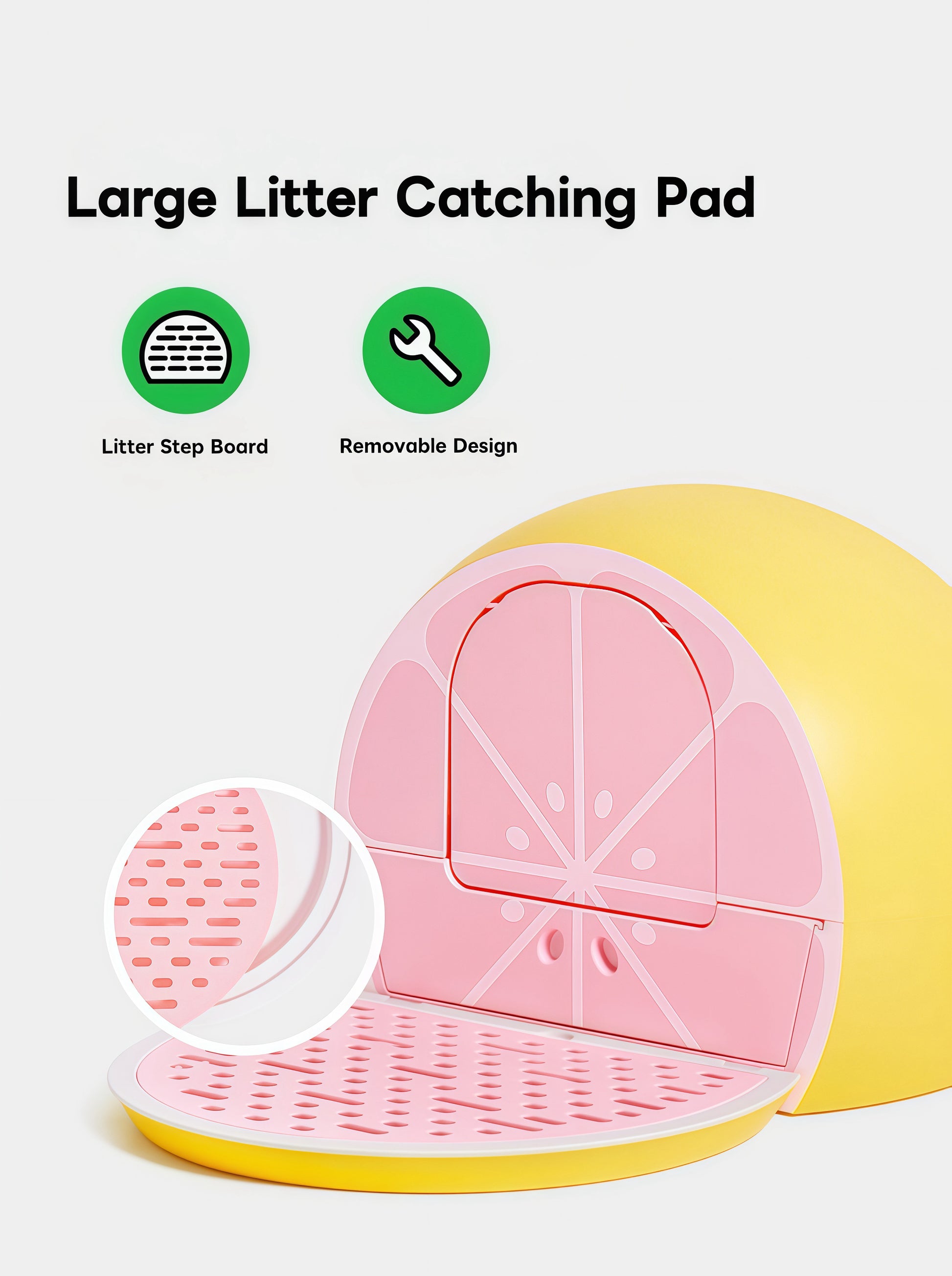 A removable, push-to-open door allows cats to enter and exit at their leisure, and the watermelon / grapefruit design makes it a fun addition to any room. Plus, thanks to its built-in sand panel, spilled litter is a thing of the past. We include a scoop and container with every order, so it's ready to use from day one.
