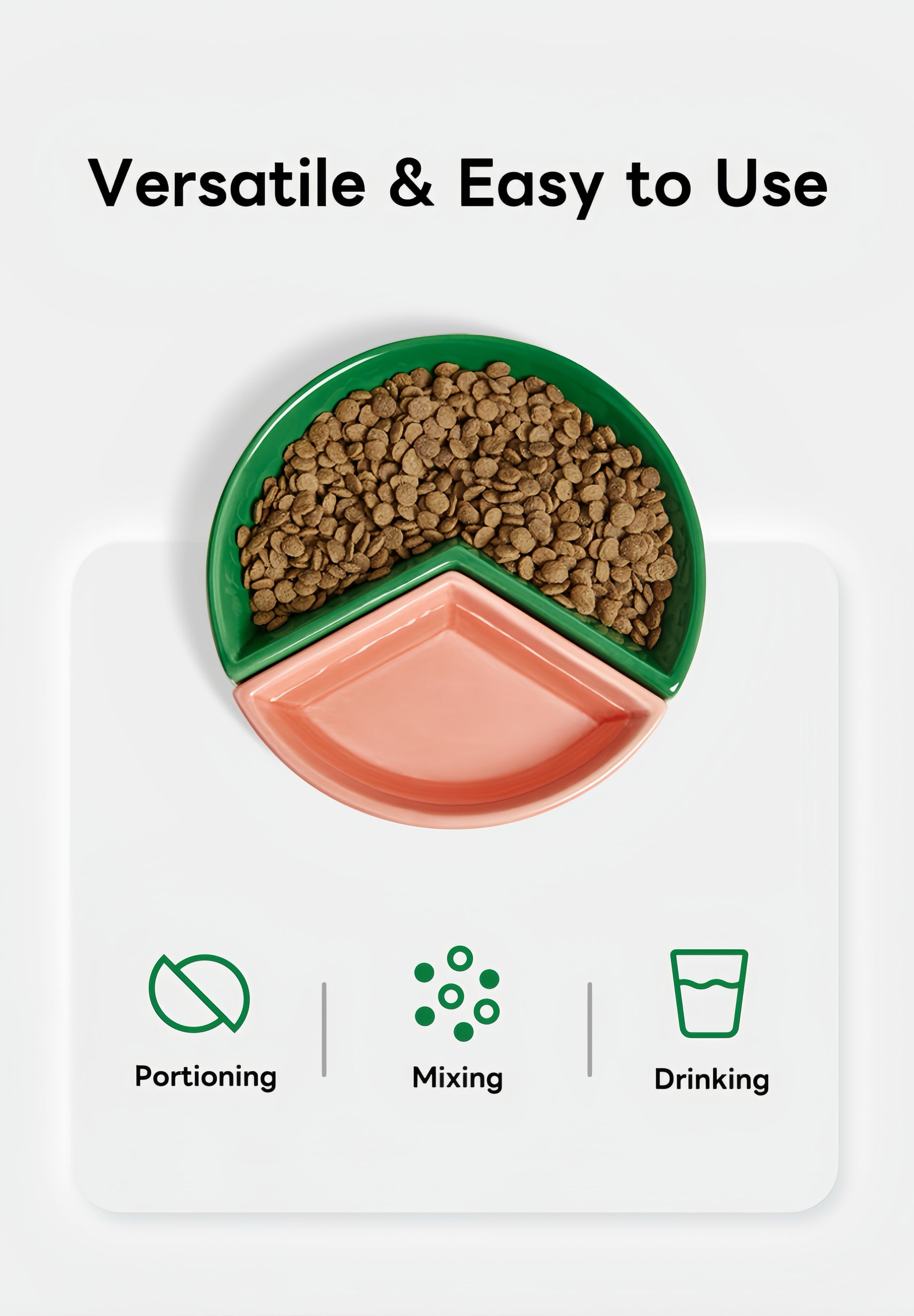 【2-IN-1 SLICE】Our novel 2-in-1 slice design makes separating wet and dry food super easy. Make sure your pet stays hydrated by switching one of the slices to water.